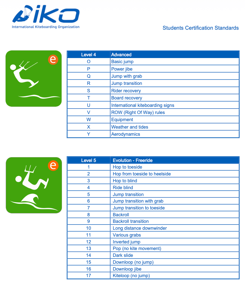 Jumps, toeside, backroll and frontroll with variations, darkslide, one footer, board-off, down + heli + kite loops, hand drag, inversions. Safety maneuvers such as self landing, self rescue, recovering a board while riding.